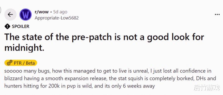 除此之外,新版本还出现任务无法完成、用户界面失效、幻化自定义功能不能使用等问题。在Reddit论坛魔兽区,充斥着各种吐槽贴,大家似乎对此已经习以为常。