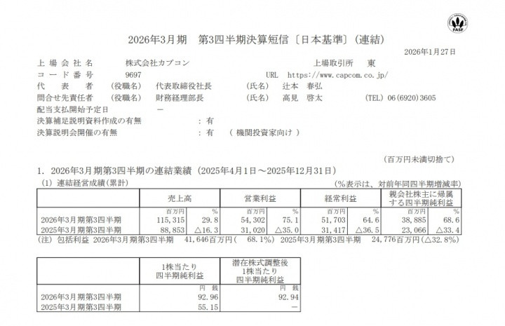 直播吧1月27日讯今日卡普空公布了25-26财年第三季度财报,在该季度,销售额为1153.15亿日元,同比增长29.8%;营业利润为543.02亿日元,同比增长75.1%。