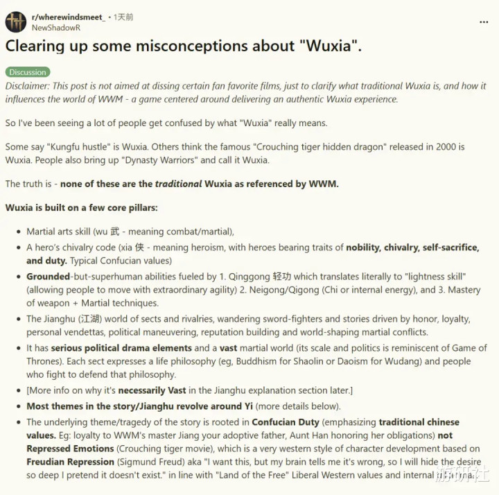 有国人在Reddit向海外玩家科普,“解释一下关于武侠的一些误区”,这里只截取了帖主的1/3的内容