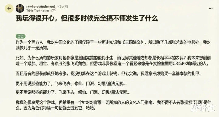 像这样科普“武侠”“仙侠”的帖子,在《燕云》Reddit社区内一直处于高赞的位置。但正如下图显示的那样,这是一个需要用大量文字解释的世界观。在短时间内理解并区分一些定义,对于0基础的外国人还是相当困难的。