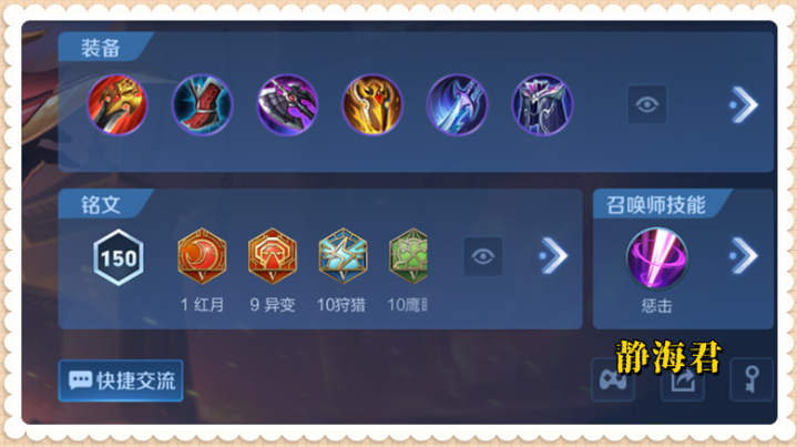 至于铭文的话,通常我会选择无双×3、红月×4、祸源×3、夺萃×3、狩猎×7、鹰眼×10。